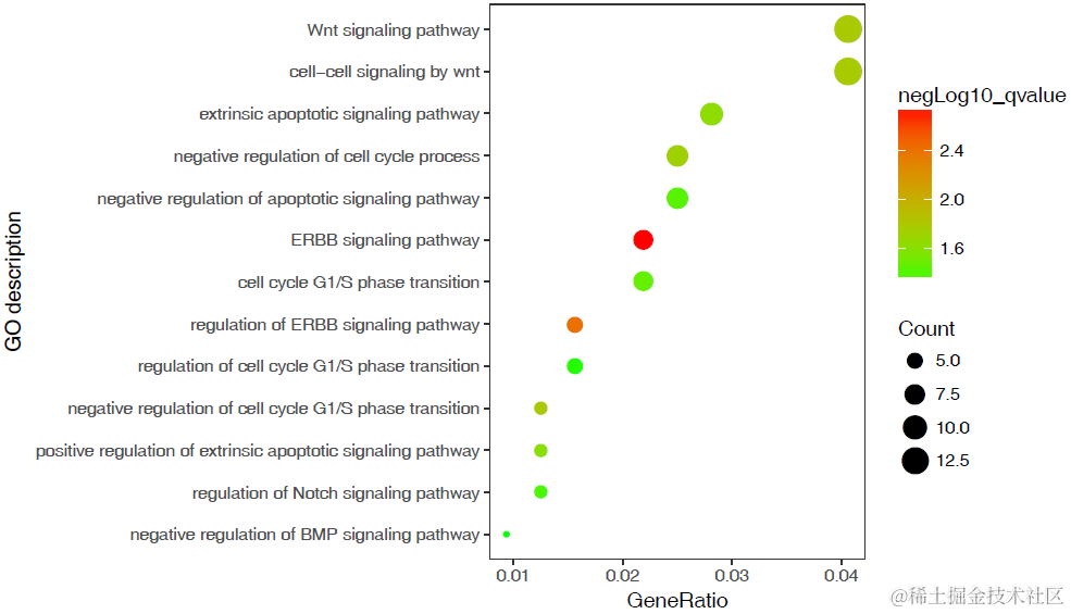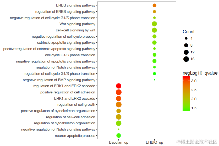 grep -v'Baodian_up'GOenrichement.xls >GOenrichement.ehbio.xls# -f: 指定输入文件,格式如上面描述# -o: 指定横轴的变量,单个样品一般选择GeneRatio或样品名字# -T: 指定横轴变量的类似,是字符串还是数值# -v: 指定Y轴显示的内容,一般为富集条目的描述# -c: 指定用哪一列设置颜色展示,一般为qvalue或p.adjust# -s: 指定用哪一列设置点的大小,一般为Count# -l: 指定某一列进行对数操作,一般选qvalue列;如果已做过对数操作,则忽略# -a: 设置图片输出高度# -x, -y: 设置横轴和纵轴标题,注意多个单词需要引号括起来