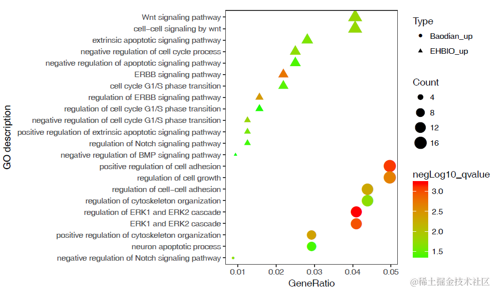 通过这张图解释下,富集分析的结果怎么解读。富集分析实际是查找哪些通路里面包含的差异基因占总差异基因的比例显著高于通路中总基因占所有已经注释的基因的比例。这一显著性通常用多重假设检验矫正过的pvalue(又称qvalue, FDR或p.adjust)来表示。在图中体现为点的颜色。从绿到红富集显著性逐渐增高。点的大小表示对应通路中包含的差异基因的数目。点的形状代表了不同类型的基因,如EHBIO中上调的基因和Baodian中上调的基因。横轴表示对应通路包含的差异基因占总的差异基因的比例, 本图中最高不过5%, 这个值越大说明通路被影响的越多。