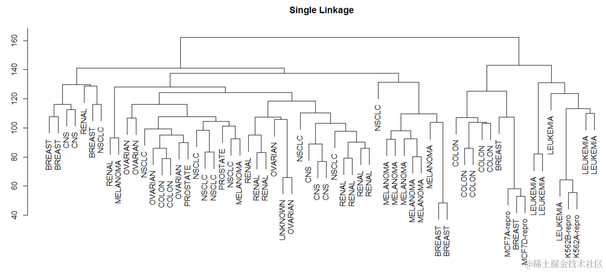 > plot(hclust(data.dist),labels = nci.labels, main = "Single Linkage", xlab = "", sub = "", ylab = "") #最短距离法
