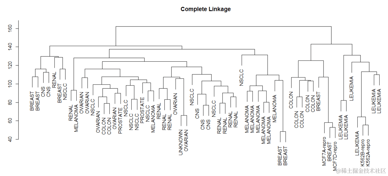 plot(hclust(data.dist),labels = nci.labels, main = "Complete Linkage", xlab = "", sub = "", ylab = "") # 默认按最长距离聚类