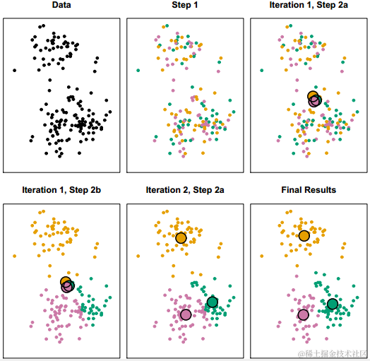 - 等到所有的样本点归类完毕,重新计算k个簇的中心;
