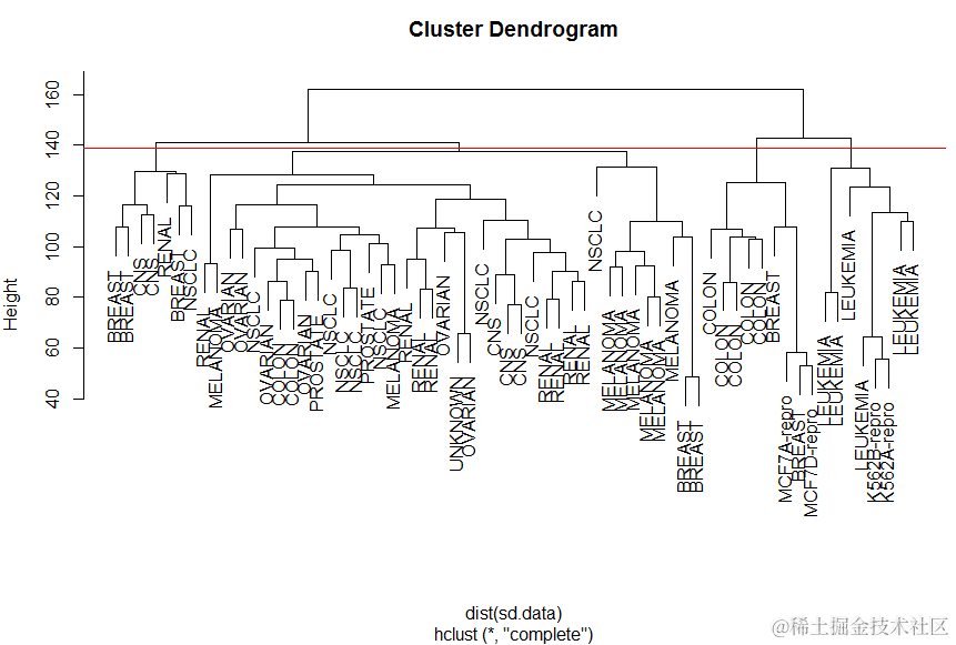 > plot(hc.out,labels = nci.labels) > abline(h=139,col="red") # 切割成4类