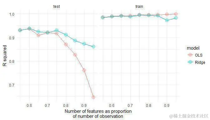 再一次地,OLS在训练数据上表现稍好,但Ridge在测试数据上更好。当特征的数量相对于训练观察的数量相对较高时,效果更显着。