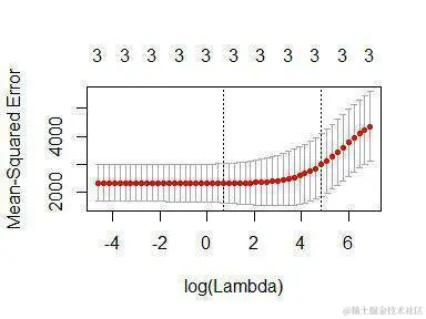 曲线中的最低点指示最佳的lambda:最好使交叉验证中的误差最小化的lambda的对数值。我们可以将这个值提取为: