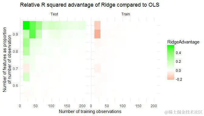下面的图有助于将Ridge对OLS的相对优势(或劣势)可视化为观察值和特征的数量: