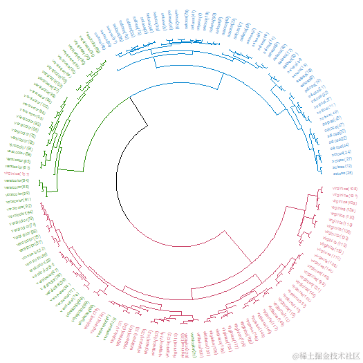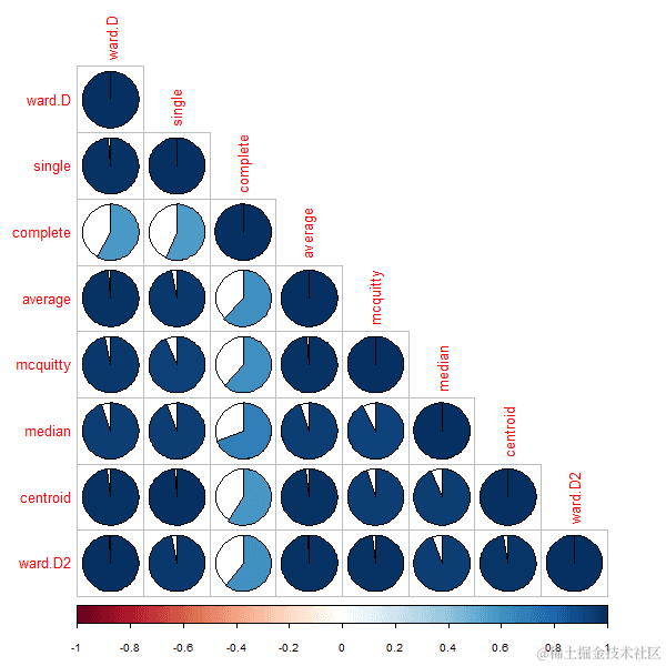 接下来,我们可以看看每个聚类结果之间的同源相关性cor.dendlist。(这可以使用corrplot包中的corrplot函数很好地绘制):