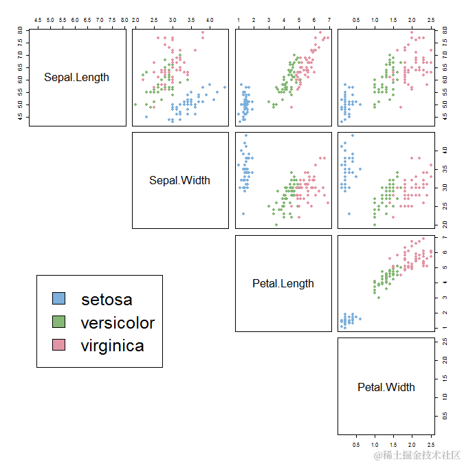 我们可以看到,Setosa物种与Versicolor和Virginica明显不同(它们具有较低的花瓣长度和宽度)。但是,基于对萼片和花瓣宽度/长度的测量,不易将Versicolor和Virginica分开。