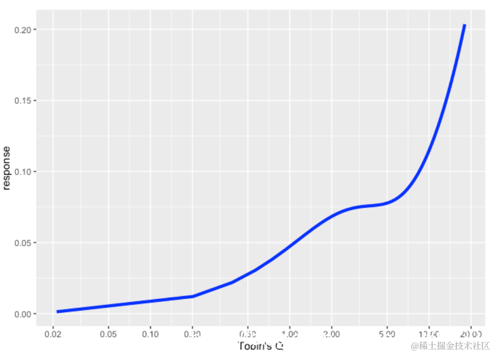现在我们非常清楚地看到,大约0.5的转折点将曲线切割成两种状态,并且两种状态的行为完全不同。该图表是关于托宾Q对预期投资的滞后影响。低Q值公司(其潜力被金融市场评估为低)可能不太愿意改变他们未来的投资计划,或者可能会改变。