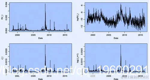 每日S&P500 RV。注意:顶部面板显示每日实现的波动率及其对数变换,和