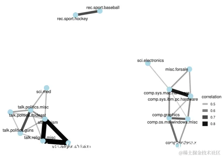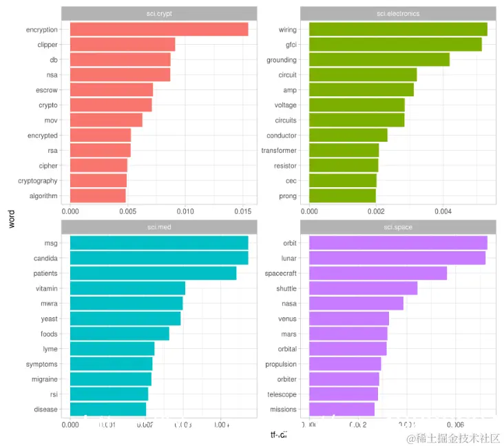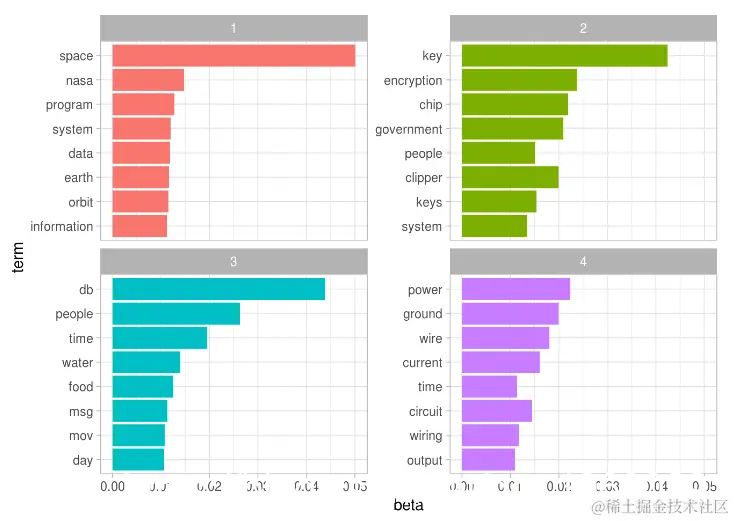 主题1当然代表sci.space新闻组(因此最常见的词是“空间”),主题2可能来自密码学,使用诸如“密钥”和“加密”之类的术语。