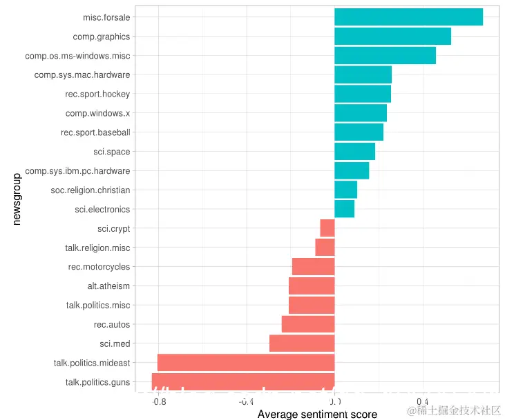 我们可以使用我们 探讨的情绪分析技术来检查这些Usenet帖子中出现的正面和负面词的频率。哪些新闻组总体上最积极或最消极?
