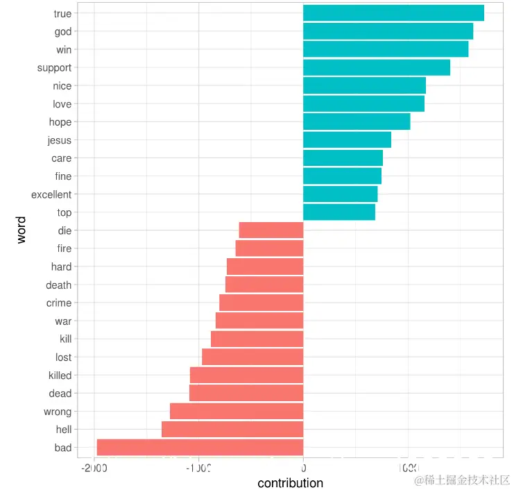 值得深入了解为什么有些新闻组比其他新闻组更积极或更消极。为此,我们可以检查每个单词的总积极和消极贡献度。