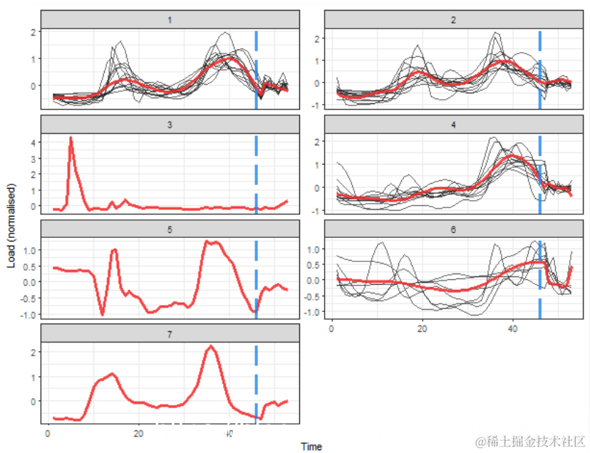我们可以看到5个典型的提取轮廓 (簇的中心)。接下来的两个簇可以称为离群值。