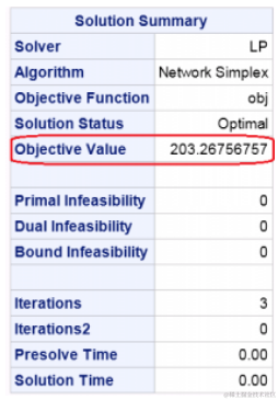 SAS / OR的解决方案如表-1所示,EMD是目标值:203.26756757。
