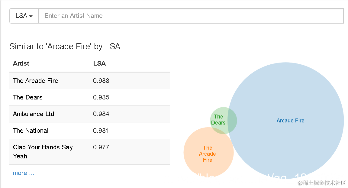 为了调用它,我使用与LSA中使用的置信矩阵相同的权重,然后以相同的方式计算相关的艺术家: