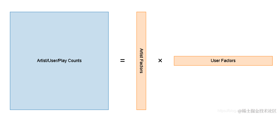 我们的想法是采用原始的播放计数矩阵,然后将其减少到两个小得多的矩阵,这些矩阵在乘以时接近原始矩阵: