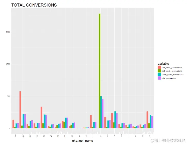 从上图中可以清楚地看到结果。从第一次接触转换角度来看,渠道10,渠道13,渠道2,渠道4和渠道9非常重要; 而从最后接触的角度来看,第20渠道是最重要的(因为在我们的例子中客户决定购买哪种产品)。就线性接触转换而言,渠道20、渠道4和渠道9是重要的。从总转换角度来看,渠道10,13,20,4和9非常重要。