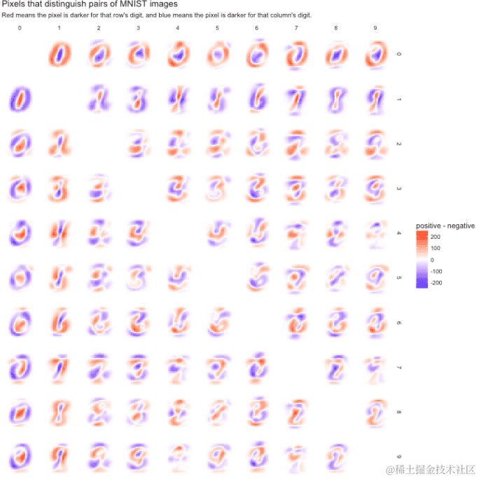 具有非常红色或非常蓝色区域的对将很容易分类,因为它们描述的是将数据集整齐划分的特征。这证实了我们对0/1易于分类的怀疑:它具有比深红色或蓝色更大的区域。