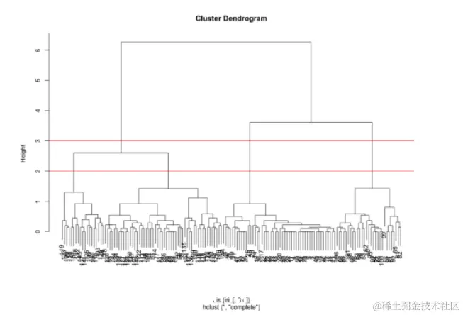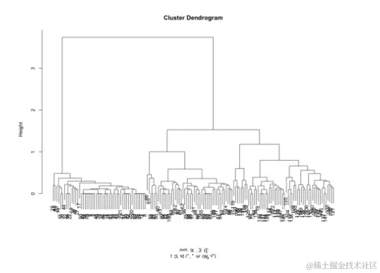 让我们看看分层聚类算法可以做得多好。我们可以使用hclust这个。hclust要求我们以距离矩阵的形式提供数据。我们可以通过使用dist。默认情况下,使用完整的链接方法。
