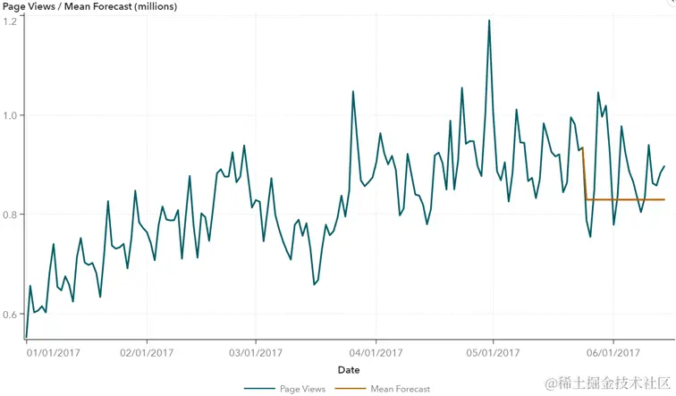 第二种类型的模型是平均模型。在这个模型中,数据集中的所有观察值都被赋予相同的权重。y的未来预测以观测数据的平均值计算。如果数据是水平的,所产生的预测可能相当准确,但如果数据趋势化或具有季节性组成部分,则会提供非常差的预测。下面可以看到使用平均模型的页面查看数据的预测值。