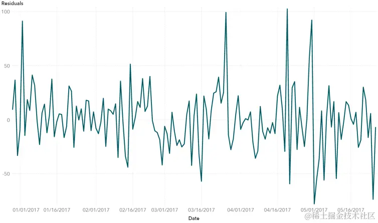 最初的模式似乎每七天重复一次,表明每周的季节。随着时间的推移浏览页面数量的持续增长表明存在略微上升的趋势。随着数据的总体思路,我们应用了平稳性统计检验,增强型Dickey-Fuller(ADF)检验。ADF测试是平稳性的单位根检验。我们在这里不会涉及细节,但是单位根表明系列是否是非平稳的,所以我们使用这个测试来确定处理趋势或季节(差异或回归)的适当方法。基于上述数据的ADF测试,我们通过在一周中的某天回归虚拟变量来移除七天的季节,并通过区分数据来消除趋势。由此产生的平稳数据可以在下图中看到。
