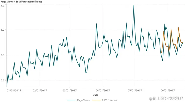 为了捕获时间序列模型中自相关的影响,有必要实施自回归整合移动平均(或ARIMA)模型。ARIMA模型包含了考虑季节和趋势的参数(例如使用虚拟变量来表示一周中的天数和差异),还允许包含自回归和/或移动平均项来处理数据中嵌入的自相关。通过使用适当的ARIMA模型,我们可以进一步提高页面浏览量预测的准确性,如图3所示。