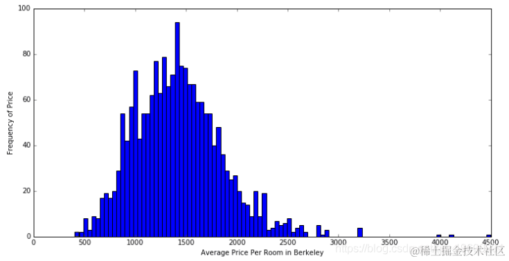 首先,这里是伯克利价格的一般直方图。这是基于从伯克利的租金收集委员会收集的数据,从中我可以获取伯克利目前被占用的9143套公寓的租赁信息,并从2014年开始租赁。这是每间客房的价格,平均为公寓楼数量由于租金管制,我认为每个房间的每栋房租都非常相似。