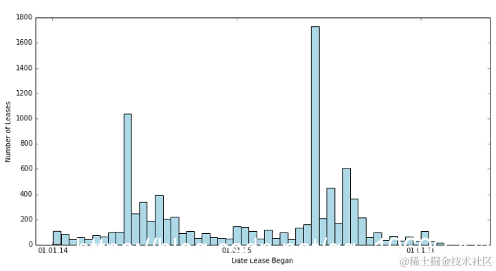 但是,我们希望探索价格随时间的关系 ,让我们看看每个月的直方图映射到当月启动的租约数量: