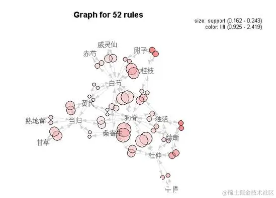 关联规则可以反映一个事物与其他事物之间的相互依存性和关联性使用关联规则挖掘算法,找到中药之间的高频组合以及强关联关系。