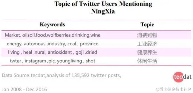 可以看到,热门推文中有关的主题有4个,根据场景的不同分别为“消费购物”、“工业经济”、“健康养生”、“休闲生活”。 有关消费购物的推文所占比例最高,推特用户中最关心的宁夏议题是消费购物。