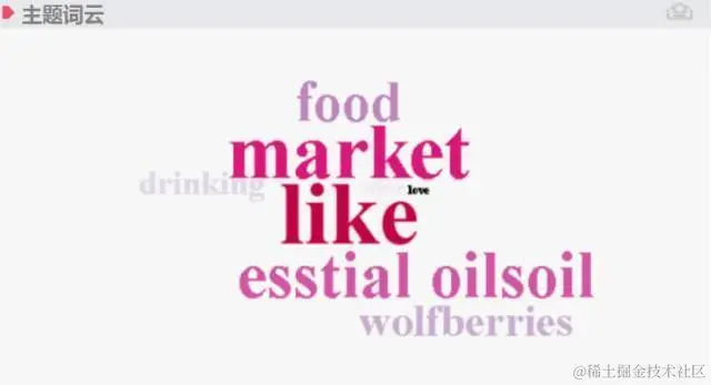 属于消费购物类的主题包括Market, oilsoil,food,wolf berries,drinking,wine,共6项,所占比例为32.6%;