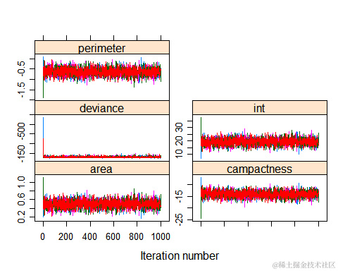 从上面的实验结果对比,我们可以看到,三个自变量对因变量均有重要的影响。area,perimeter,campactness几个变量他们对groovelength这个变量均有重要的影响.同时我们可以认为回归模型的结果和内置贝叶斯模型的结果相似。然后我们使用rjags&R2jags软件包来对数据进行贝叶斯型的建立,从结果来看,同样和之前得到的模型结果相差不大。并且我们通过模型的迭代,可以得到每个参数的置信区间。