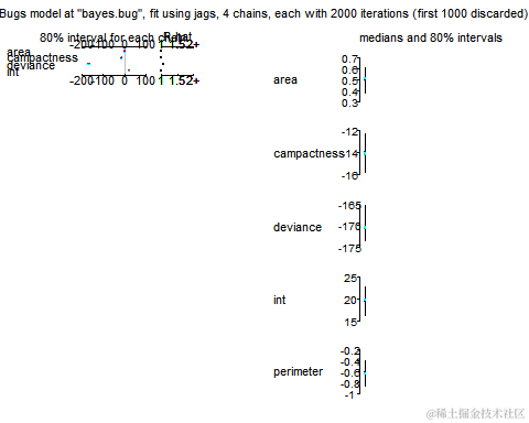 从内置贝叶斯模型的结果来看,3个变量同样是非常显著,因此模型的结果和回归模型类似。然后我们使用BUGS/JAGS软件包来建立贝叶斯模型