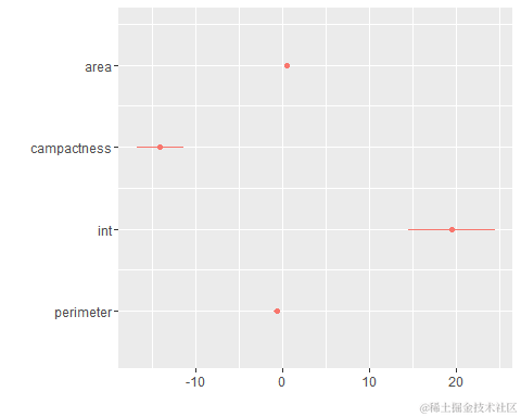从结果来看,可以看到各个变量参数的置信区间,campatness和int的置信区间较大,而其他两个变量的置信区间较小。
