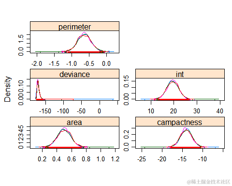可以看到每个变量的参数,的密度分布近似于正态分布。同时我们可以看到分布的均值和内置贝叶斯模型,得到的结果类似。
