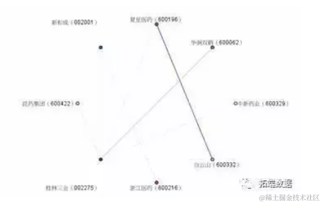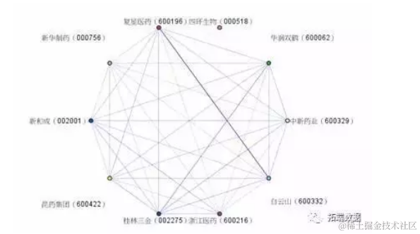 线段的粗细程度由线段两端点的股票的价格同时上涨的天数决定,如果线段两端的股票的价格同时上涨的实际情况的频数越大,那么链接两只股票间的线段就越粗。如果线段两端的股票的价格同时上涨的实际情况的频数越小,那么链接两只股票间的线段就越细。从这一图中很明显的可以看出复兴医药和白云山之间有着很强的关联。