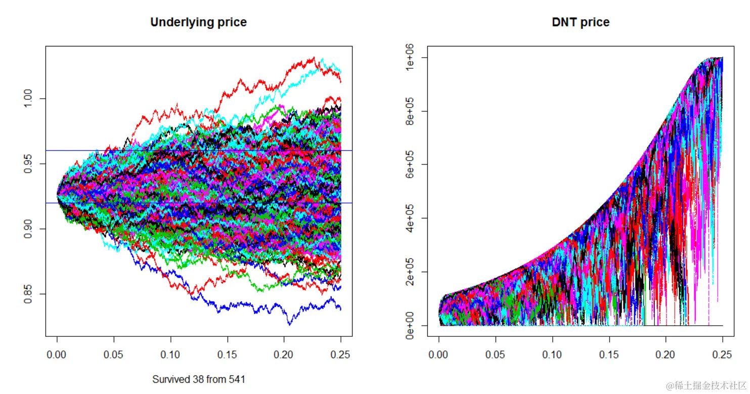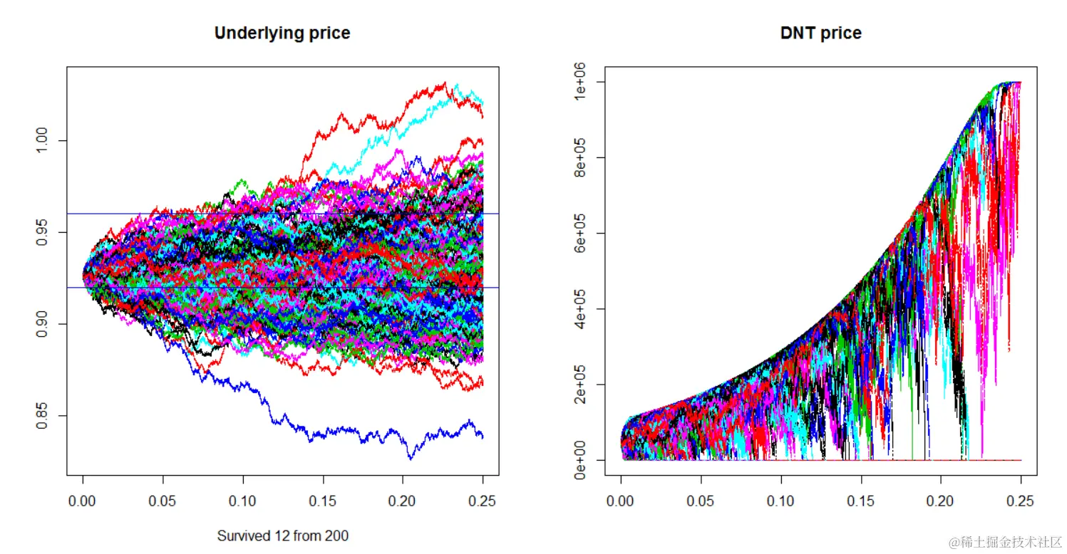 Double-no-touch(DNT)选项是二元期权,在到期时支付固定金额的现金。不幸的是,fExoticOptions包目前不包含此选项的公式。我们将展示两种不同的方式来定价包含两种不同定价方法的DNT。在本节中,我们将调用函数dnt1,对于第二种方法,我们将使用dnt2作为函数的名称。