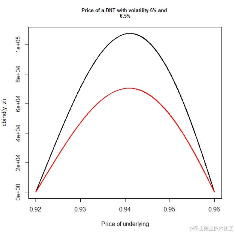 既然我们有一个很好的公式,就可以绘制一些与DNT相关的图表来更熟悉这个选项。之后,我们将使用具有以下参数的特定AUDUSD DNT选项:L等于0.9200,U等于0.9600,K(支付)等于100万美元,T等于0。25年,波动率等于6%,