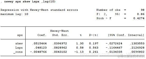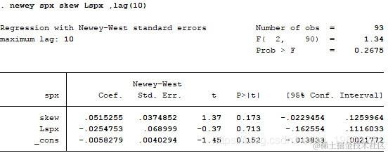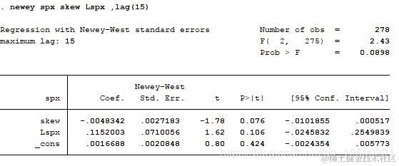 显然,索引返回数据集具有异方差性和自相关特性。运行Newey-West回归数据来调整异方差性和自相关性。