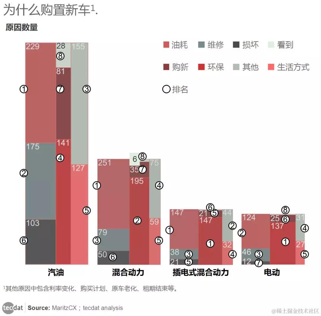 从购买的数量来看,最多的是汽油动力车,其次是混合动力,最少的是电动力车。可以看到大部分车主购买新车的原因是因为油耗。插电式混合动力和电动车的车主中有大部分购买新车原因是环保。相对来说,汽油动力车的车主购置新车的第二大原因是维修原因,而在新能源车类型中,排在油耗和环保的因素之后。排除其他原因后,有一部分车主由于生活方式的改变而购置新车。