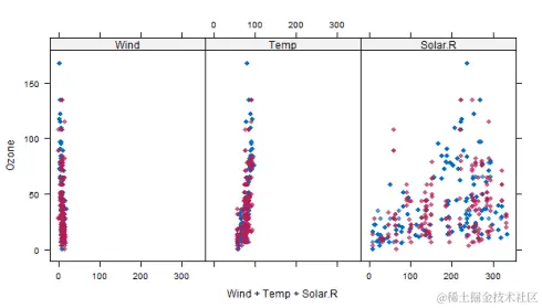 xyplot(tempData,Ozone_Wind + Temp + Solar.R,pch = 18,cex = 1)