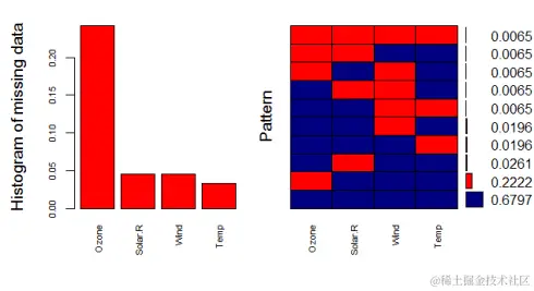该图有助于我们理解几乎70%的样本没有遗漏任何信息,22%的人缺少臭氧值,剩余的样本显示其他遗漏的模式。通过这种方法,我认为情况看起来更清楚一些。