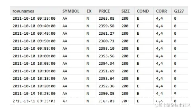 colnames(sample_tdataraw)=c(" ","SYMBOL","EX","PRICE","SIZE","COND","CORR","G127")