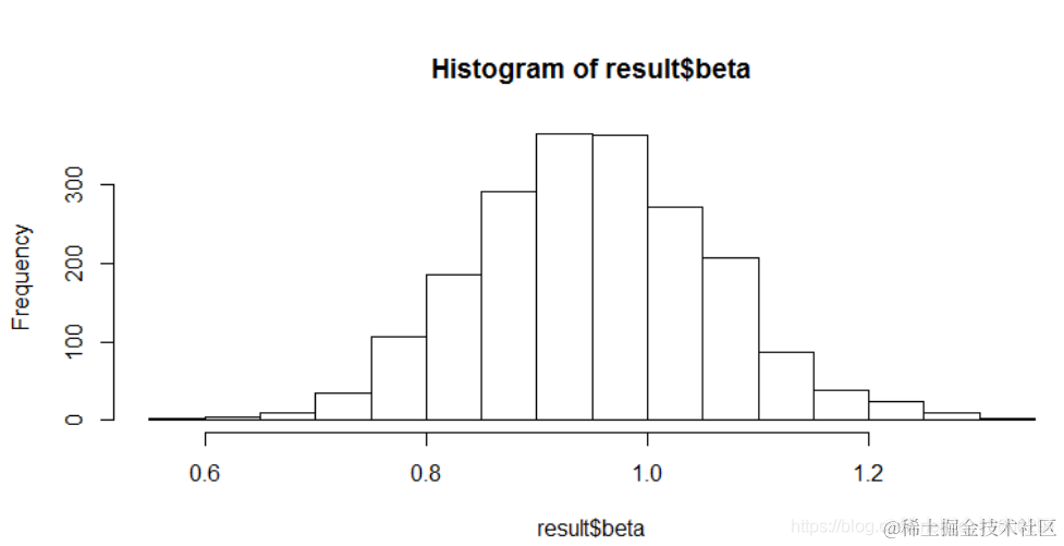 对于回归斜率β,我们的后验均值为0.95(接近用于模拟数据的真实值1)。为了形成95%的后验置信区间,我们简单地采用取样后验的2.5%和97.5%的百分位数,这里是0.75到1.17。