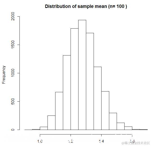 现在样本均值的分布(来自人口的重复样本)看起来非常正常。当n很大时,即使我们的一个观测结果可能位于分布的尾部,分布中心附近的所有其他观测值也会保持平均值。这表明对于这个特定的X分布,t检验应该是正确的,n = 100 。检查这种情况的更直接的方法是进行模拟研究,其中我们凭经验估计t检验的1型错误率,在给定的n选择下应用于该分布。