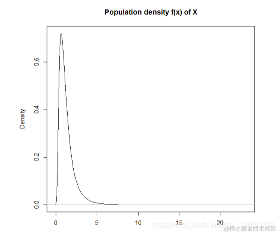现在让我们用R来检验样本均值分布(在重复样本中)收敛到正态分布的速度。我们将模拟来自对数正态分布的数据 - 即log(X)遵循正态分布。我们可以通过从正态分布中取幂随机抽取来从此分布中生成随机样本。首先,我们将绘制一个大的(n = 100000)样本并绘制其分布以查看它的外观: 我们可以看到它的分布是高度偏斜的。从表面上看,我们会担心对这些数据使用t检验,假设X是正态分布的。