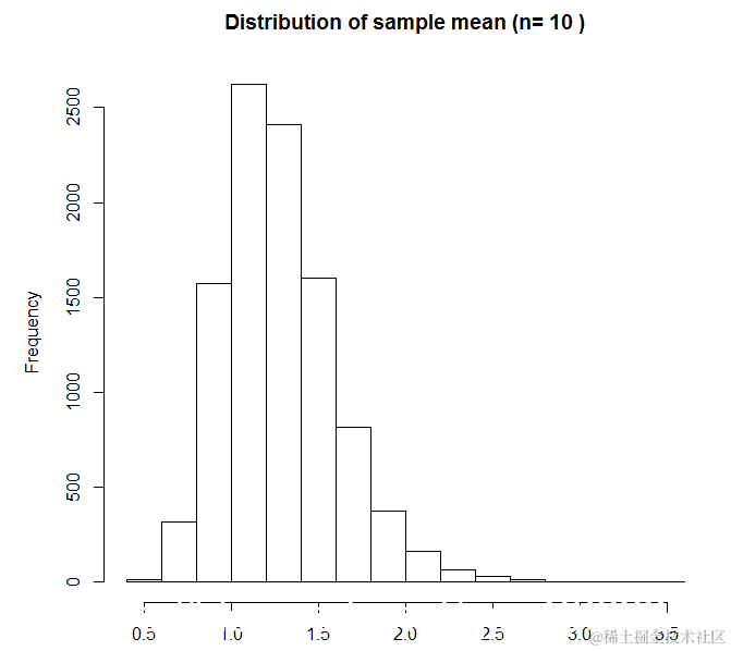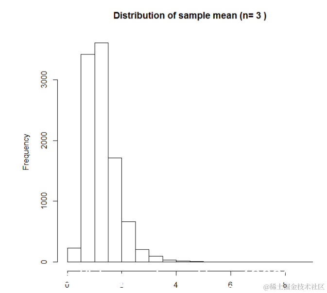 为了看看样本的样本分布,我们将选择样本大小为n,并从对数正态分布中重复绘制大小为n的样本,计算样本均值,然后绘制这些样本均值的分布。以下显示n = 3的样本平均值的直方图(来自10,000个重复样本):