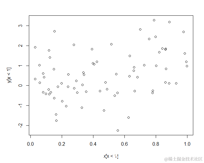 lm(formula = y[x < 1] ~ x[x < 1])