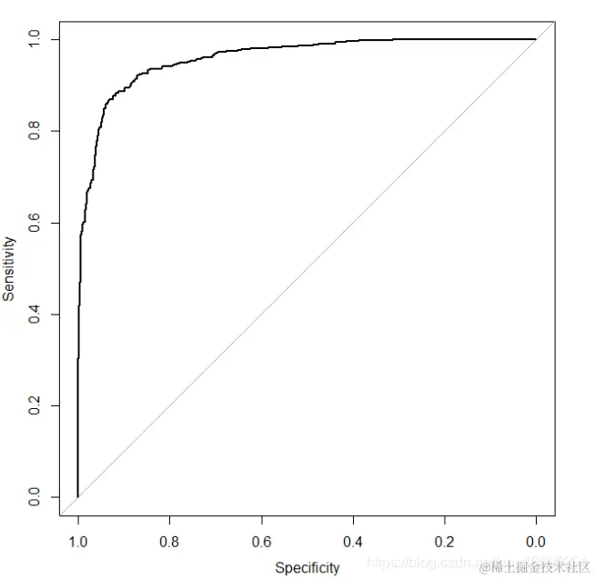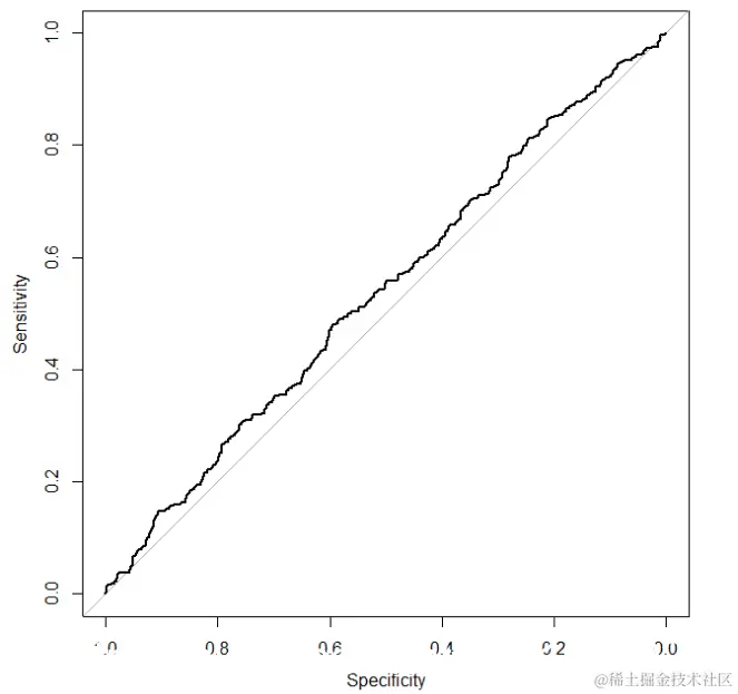我们现在加载pROC包,并使用roc函数生成一个roc对象。基本语法是指定回归类型方程,左侧是响应y,右侧是包含拟合概率的对象: