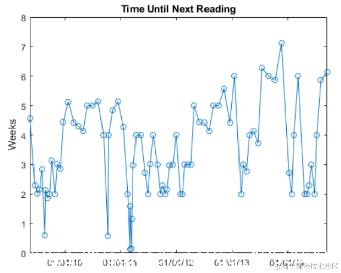 每次INR读数确定何时必须对患者进行测试。使用diff构建测量之间的时间间隔的向量。以周为单位表示间隔,并使用与以前相同的x轴绘制它们。